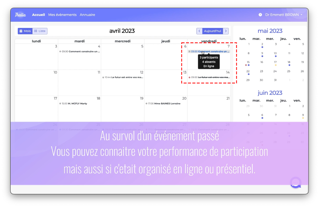 Vous pouvez facilement retrouver vos événements passés en deux clics de souris, et grâce au survol de la souris, vous pouvez constater la performance de participation d'un événement et son lieu (en ligne ou en présentiel).