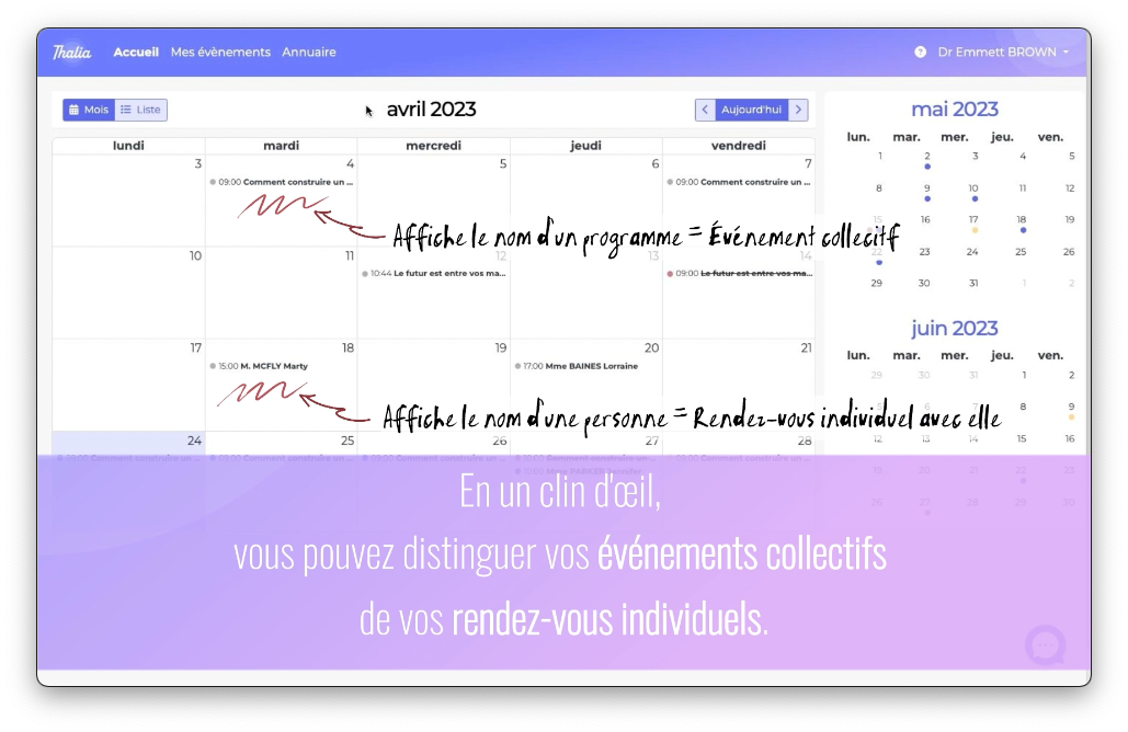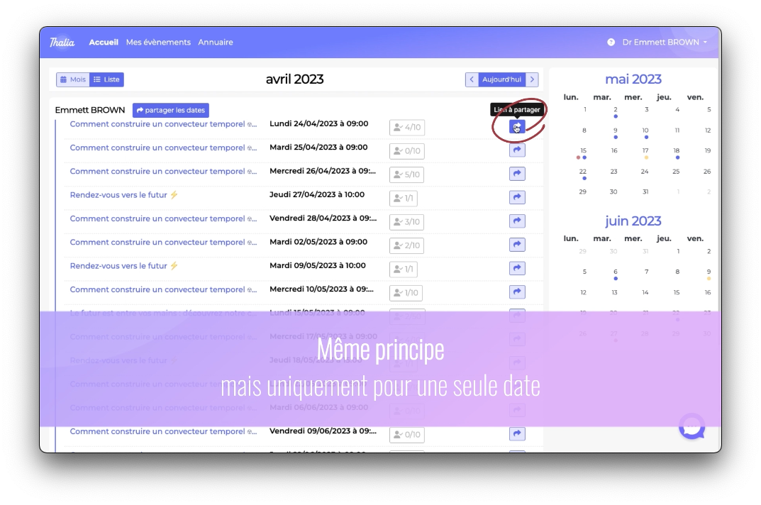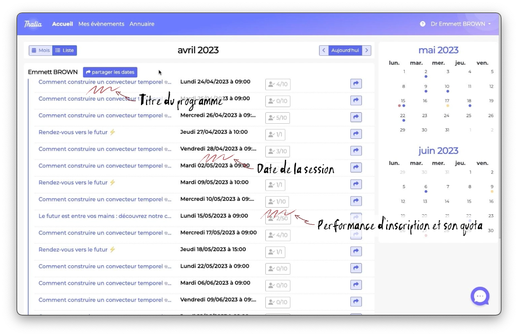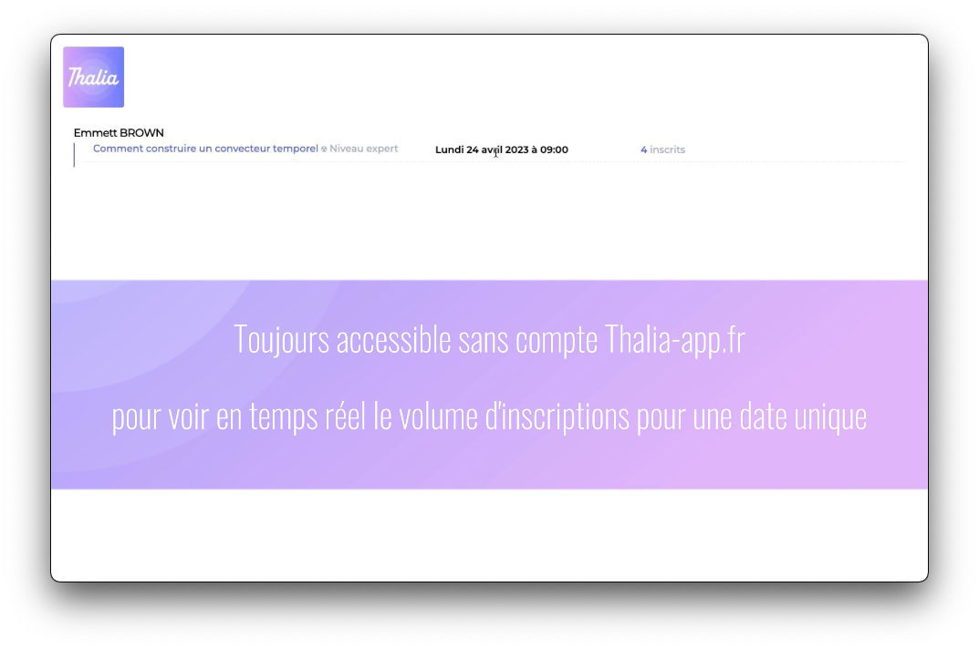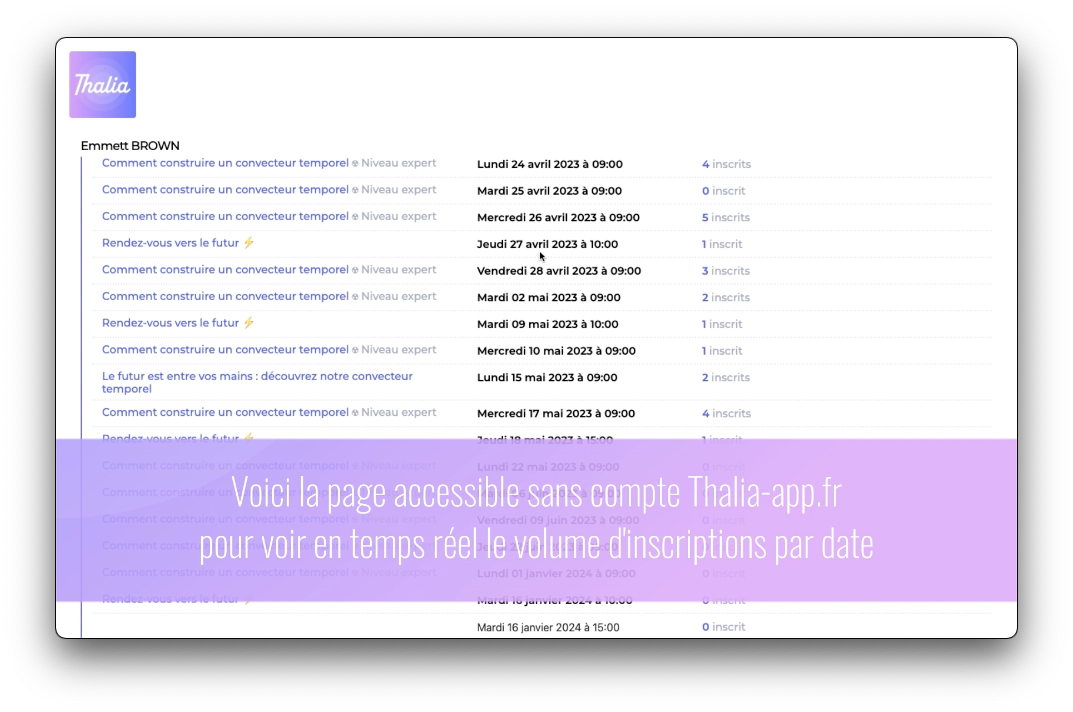 Ils vous permettent de visualiser vos volumes d'inscriptions sans avoir besoin de vous connecter, et vous pouvez également partager cette page avec des personnes qui n'ont pas de compte sur Thalia-app.fr. Vous pouvez partager la totalité de vos programmes et de vos dates,