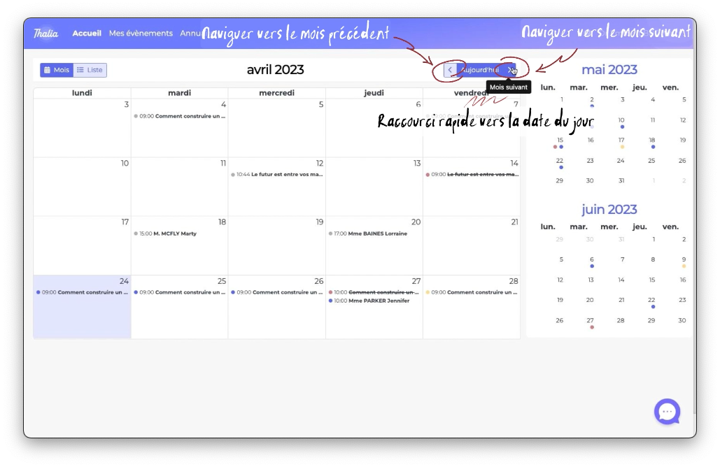 Vous pouvez utiliser le menu de navigation pour retrouver rapidement les événements ou rendez-vous collectifs passés, présents ou futurs dans les différents mois.
