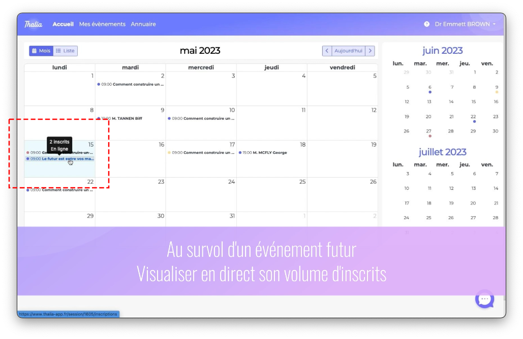 Pour les événements futurs, au survol d'une date, vous pouvez suivre les volumes d'inscriptions et de pré-inscriptions.