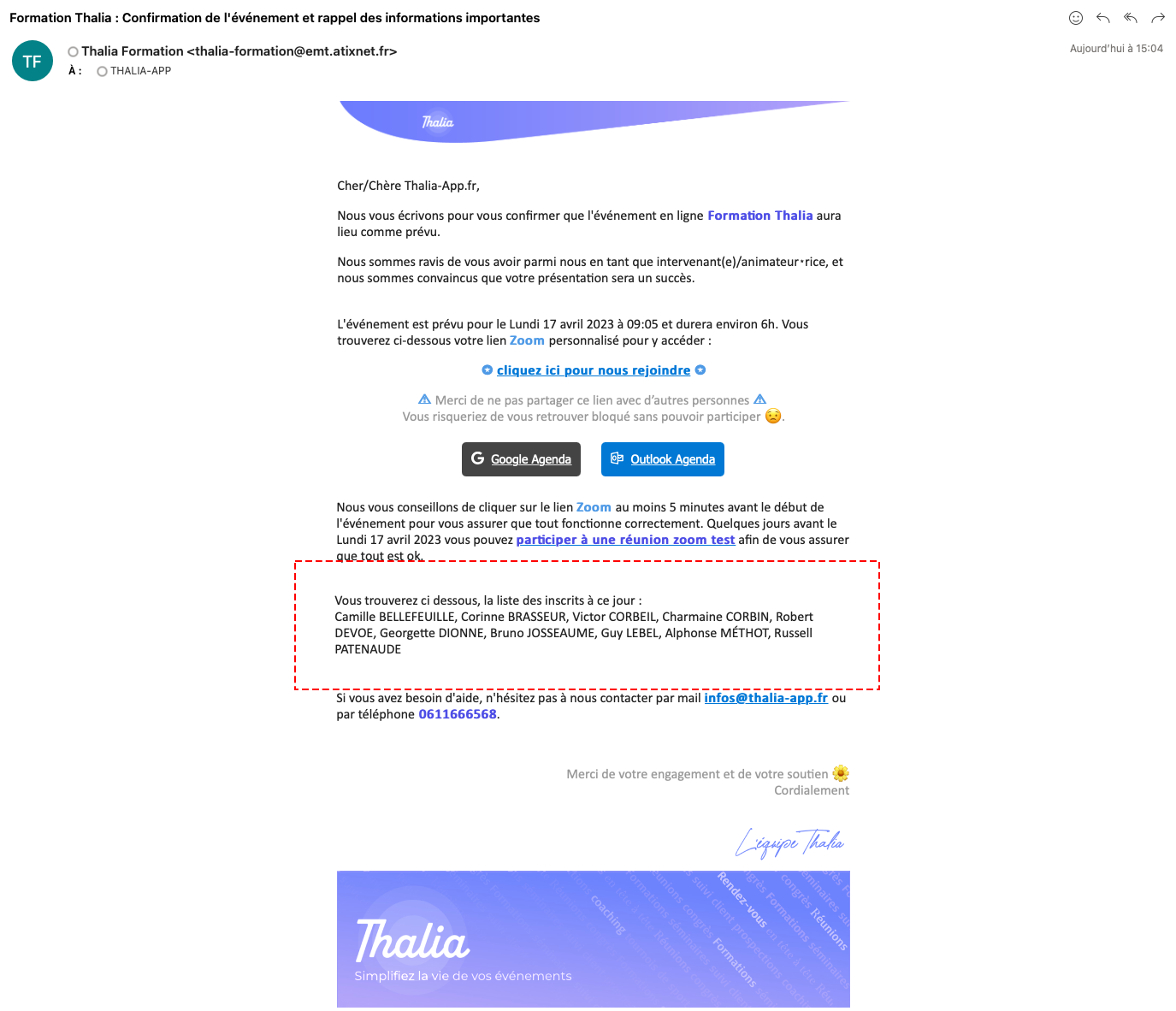 Voici un exemple de mail pour l'intervenant d'un événement avec 10 inscrits à cette date :
