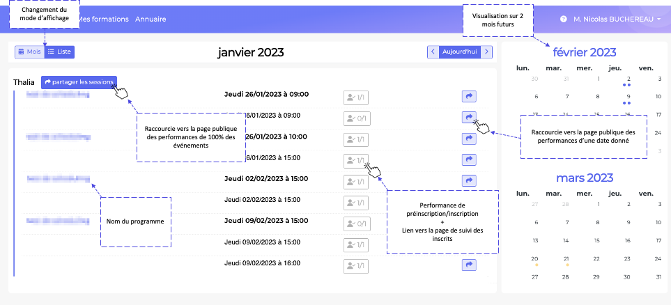 Le mode d'affichage liste est la plus simple méthode de pilotage de vos événements présents / futurs