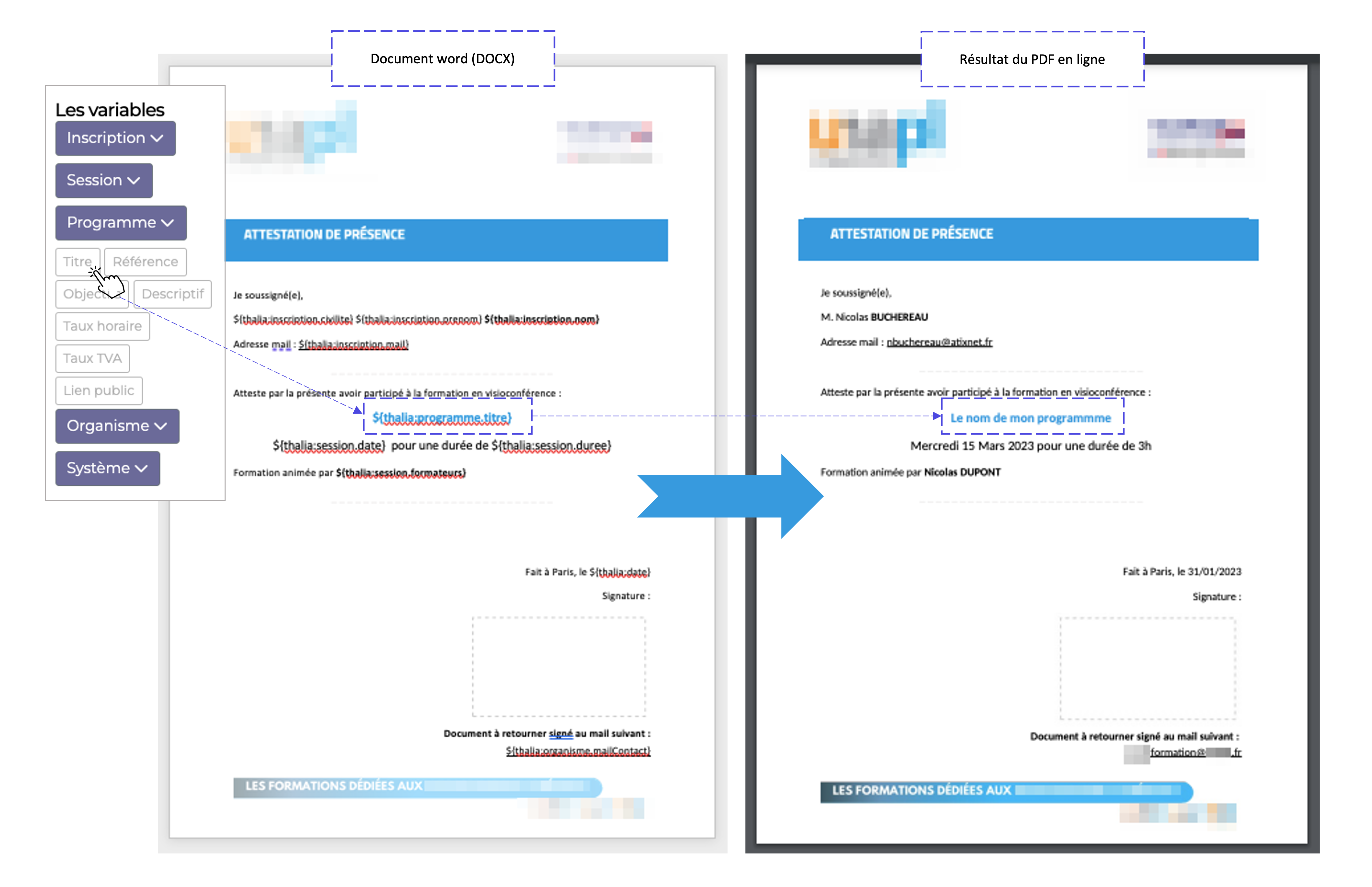 Le principe de document généré à la volée se base sur l'utilisation d'un document word au format DOCX injecté dans Thalia et utilisé dans un mail transactionnel contenant des informations dynamiques grâce aux 46 variables à votre disposition, mais aussi du texte, des images et une mise en page complexe.
