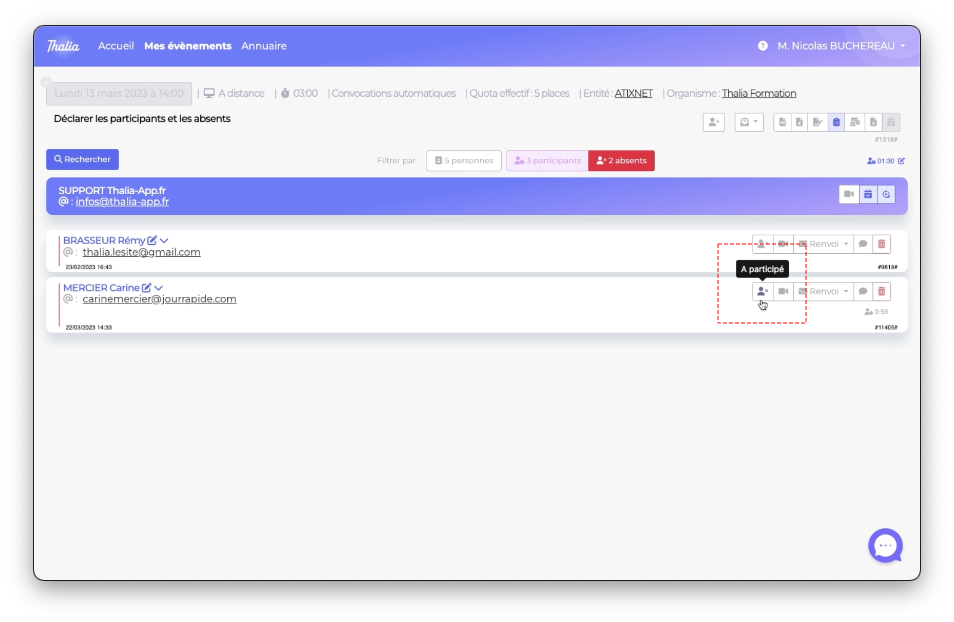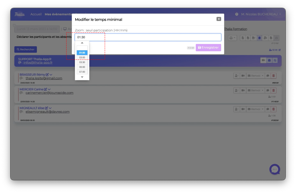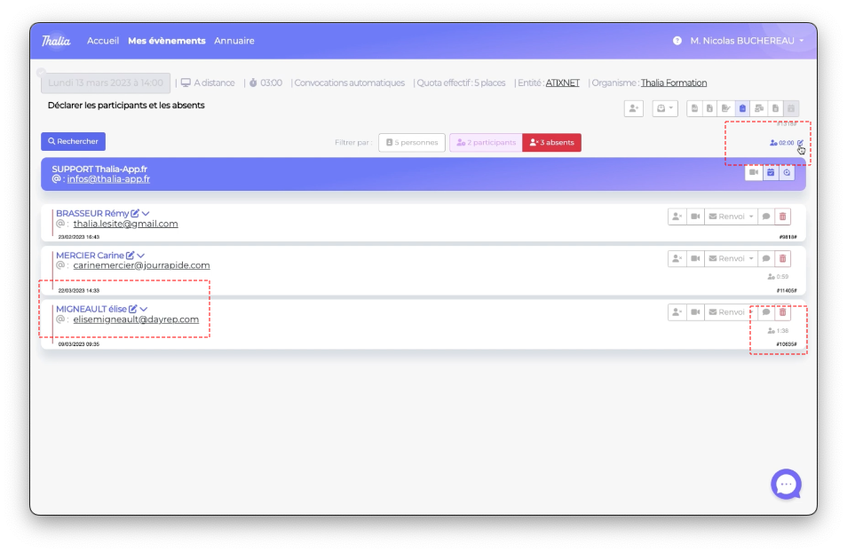 Cependant, dans la liste des absents, nous avons Elise (on l'aime bien Elise 🌺) qui a une durée de connexion de 1h38 alors que le seuil de session est réglé à 2h00. Si vous souhaitez la déclarer participante, vous pouvez le faire manuellement en modifiant le seuil par défaut.