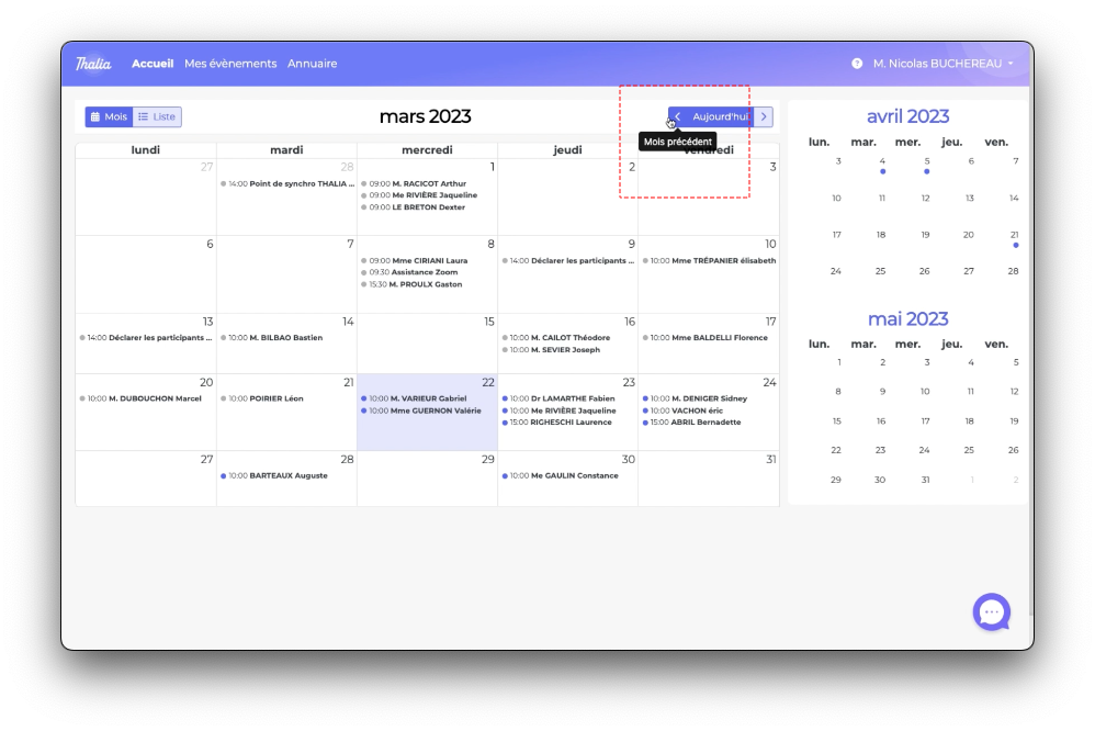 Le calendrier d'accueil, vous permet de retrouver le plus rapidement possible un événement passé / actuel / ou futur.