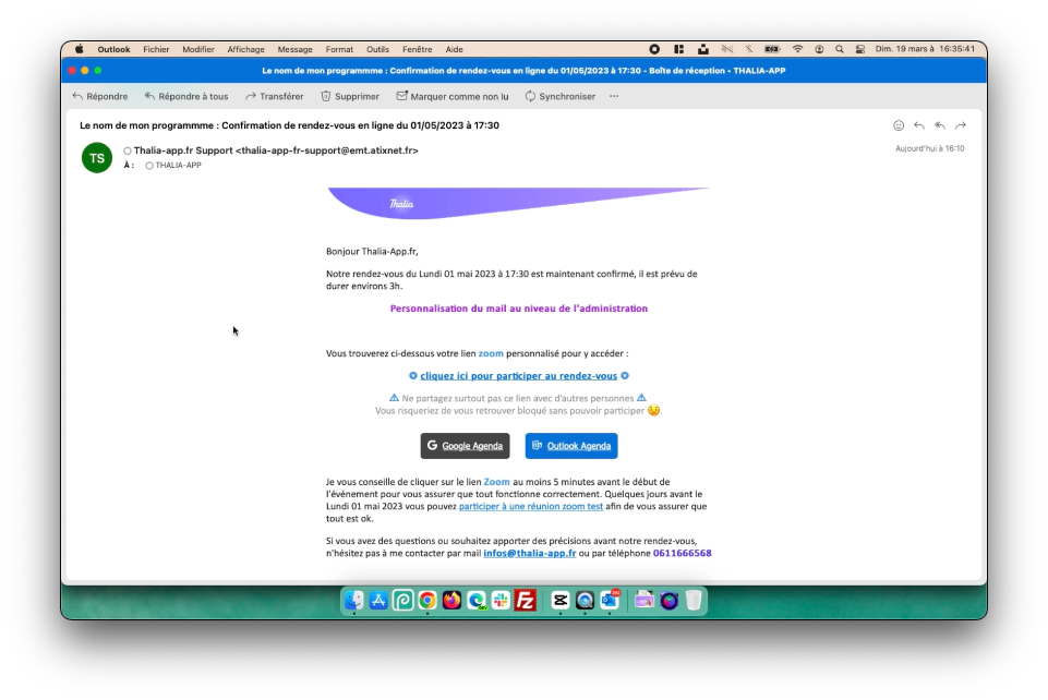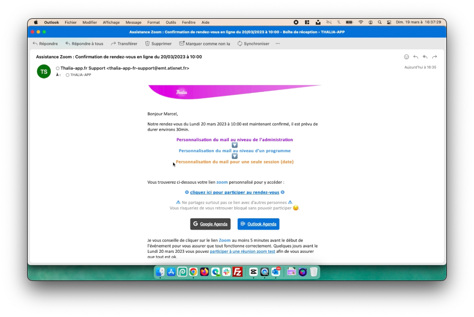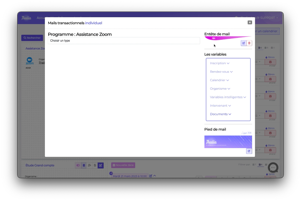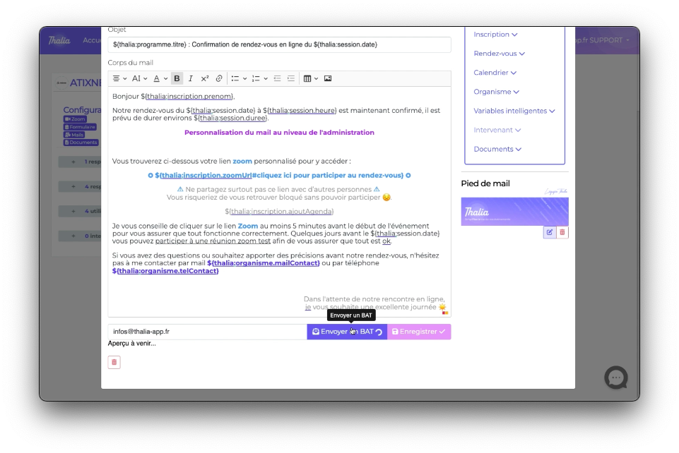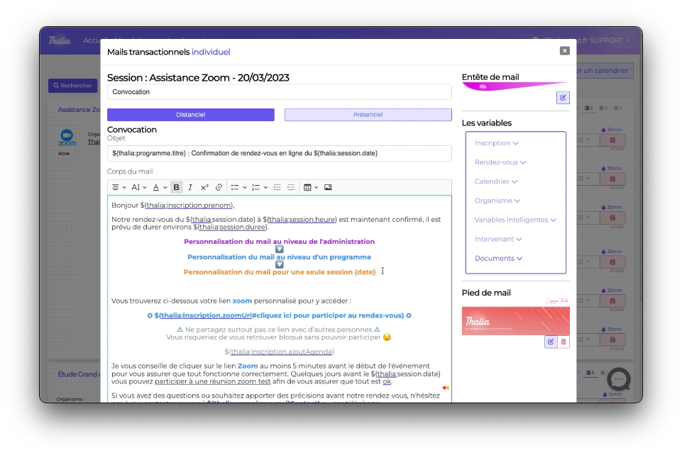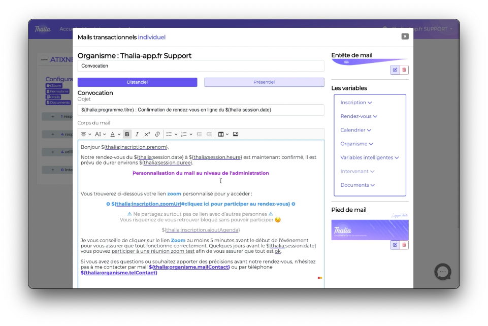Nous allons personnaliser le contenu du mail convocation d'un programme (assistance zoom pour notre exemple)