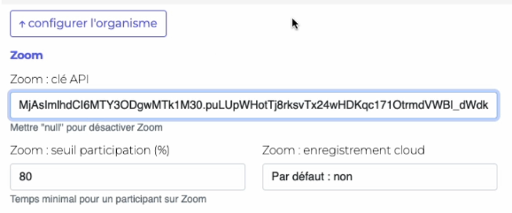 Coller ce token dans la case Zoom : clé API dans Thalia