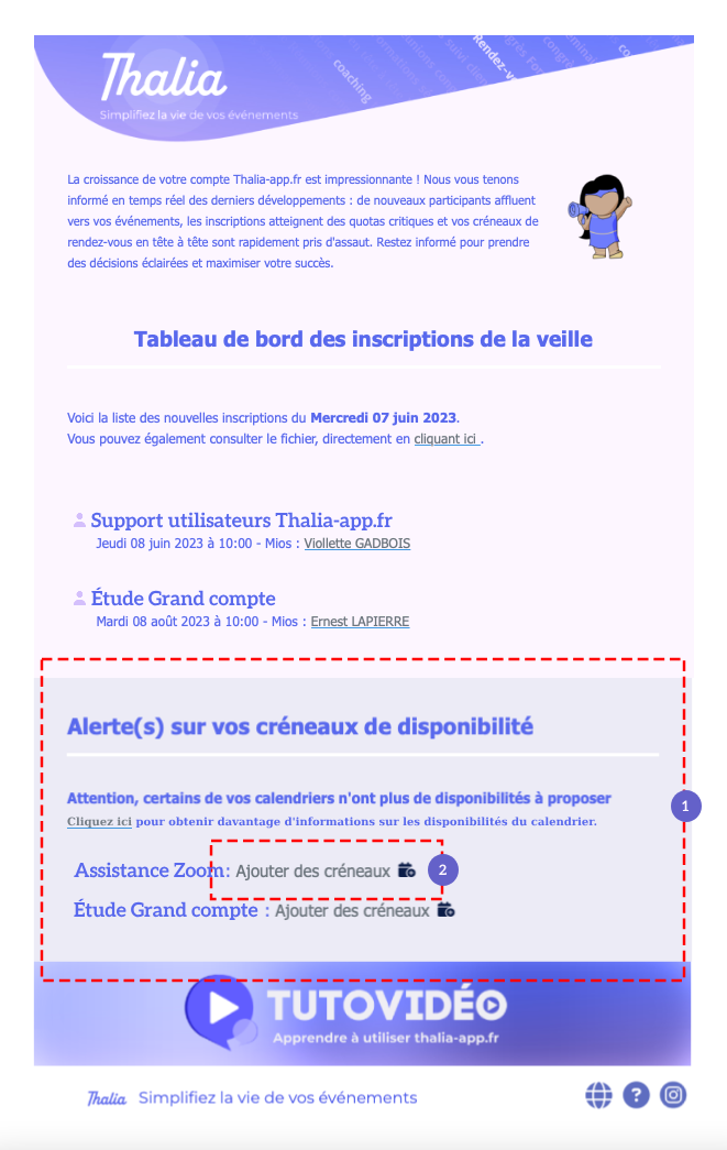 Lorsque vous avez plusieurs calendriers, il peut devenir rapidement difficile de suivre l'ensemble des calendriers pour savoir s'il reste des créneaux ouverts dans le futur. Votre journal de bord par email est là pour vous alerter 1️⃣. À vous de décider si vous devez ouvrir de nouveaux créneaux dans le futur ou si vous prévoyez de ne plus utiliser ce calendrier.