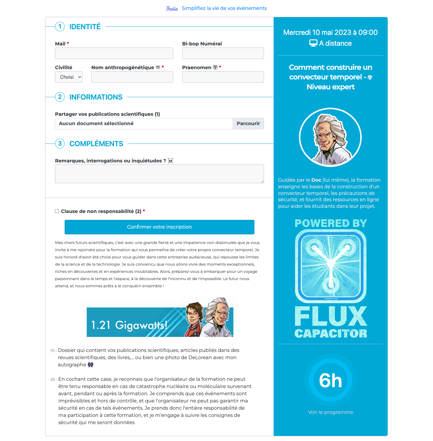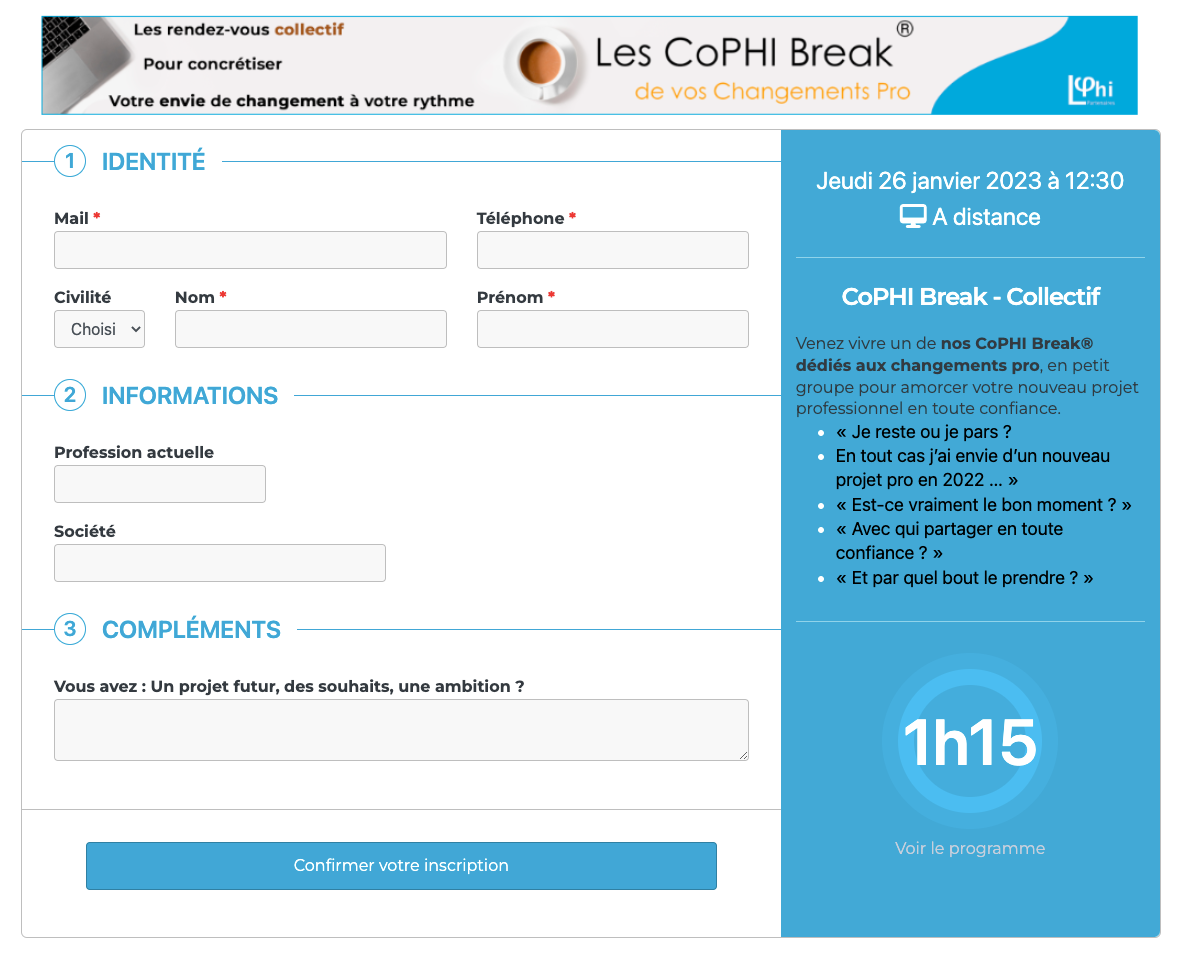 - Le résumé sera utilisé dans le bandeau bleu du formulaire d'inscription (peu de place à disposition)